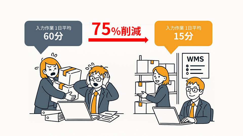 以前は、現場作業が終わりデスクに戻る夕方5時頃から、在庫計上として伝票を基幹システムに手入力していました。1時間近くかかるこの作業が、現場作業で疲れているスタッフの帰宅時間を遅らせ、負担になっていました。ロジザードZERO導入後は、現場でハンディ端末を使って入荷検品を行うだけでデータ化が完了します。あとはそのデータをCSVで基幹システムにインポートするだけ。結果、1日平均60分かかっていた入力作業が15分に短縮され、約75%の工数削減を達成しました。作業が終わればすぐに帰れるようになり、入力ミスも激減し、現場の雰囲気も明るくなりました。